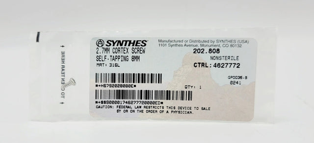 Synthes 202.808 2.7mm Cortex Screw Self Tapping 8mm is backordered and will ship as soon as it is back in stock.